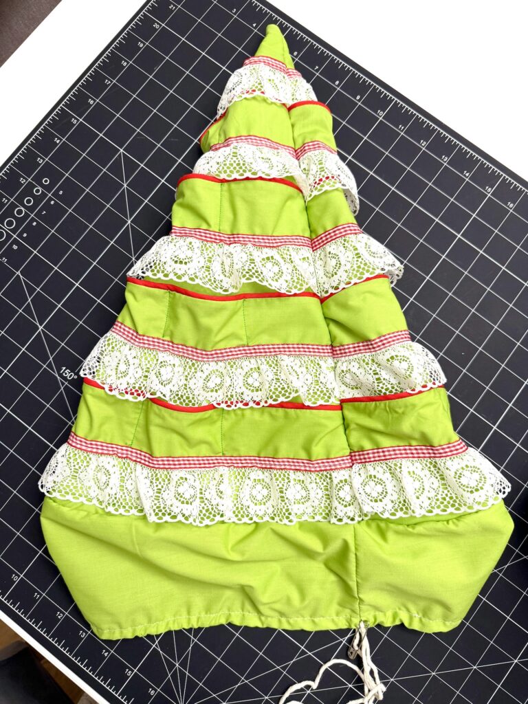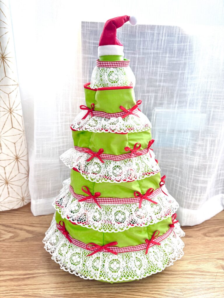 This tabletop advent tree has hidden pockets underneath the lace layers to hide small gifts as you count down the days until Christmas.