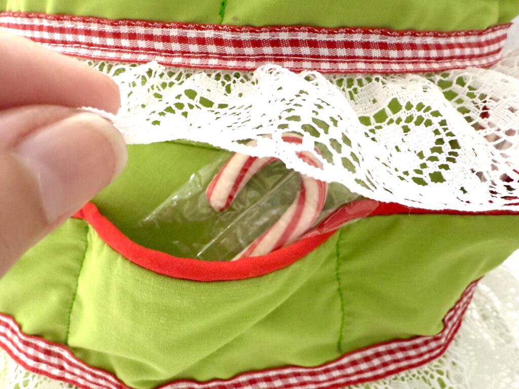 Toys, candy or small notes can be tucked into the pockets which are covered with the lace edging.