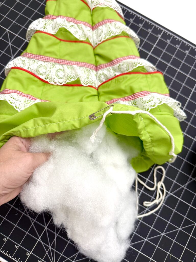 Stuff the tree with Polyfil, making sure to stuff the top of the tree with enough fiberfill to make it pointed. Continue adding stuffing until the tree is stuffed firmly!